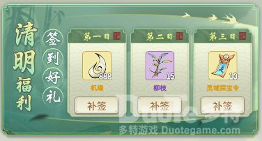 在活动期间,只要登录游戏完成签到就能领取清明赠礼,签到前三日可获得机缘*888、柳枝*15和探宝令*10,记得要上线领取奖励喔!如果有仙友不小心忘记签到也问题不大,50机缘即可补签回来。
