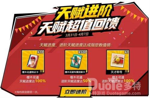 活动期间,使用樱木花道完成指定任务可获得“特训卡碎片”&“专属技能卡”限时获得。如果和好友组队“开黑”并在赛后给好友点赞,还可获得海量潜能材料!让玩家在享受与好友开黑的快乐还能收获满满的福利。