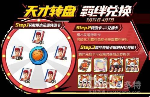 本次更新首当其冲的就是为庆祝樱木花道生日而特别设计的活动——天才转盘啦!玩家可以消耗从商场购得的“天才转盘币”参与“天才转盘”抽奖,每次抽取都有机会随机获得“樱木花道特训卡”道具。数量由1-30不等,检验欧皇气质,来“天才转盘”就对了!