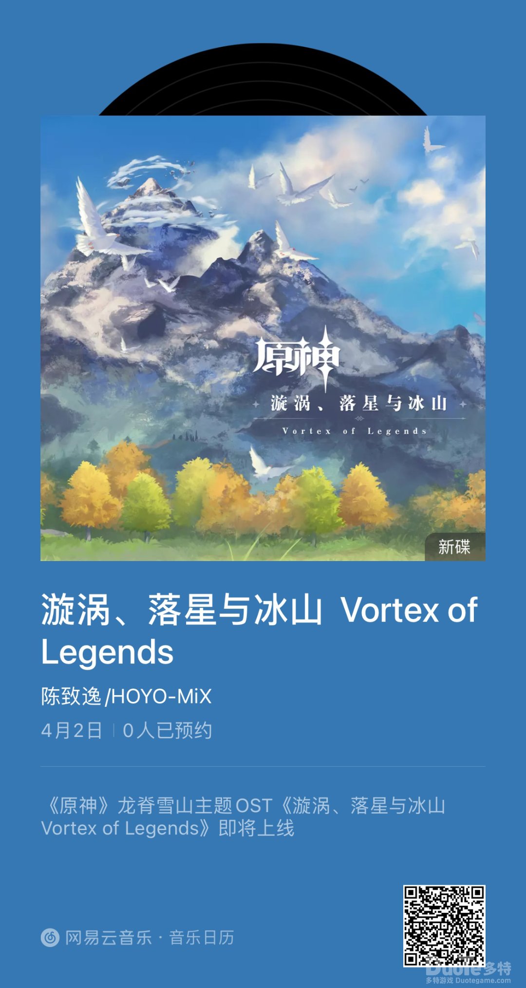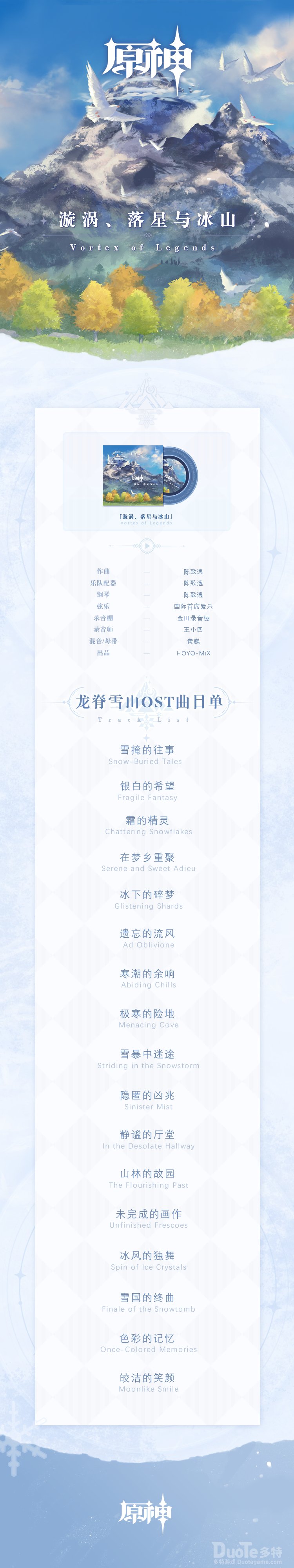 旅行者们大家好,《原神》龙脊雪山主题OST《漩涡、落星与冰山 Vortex of Legends》将于4月2日(本周五)正式上线,共收录17首由陈致逸@HOYO-MiX为《原神》龙脊雪山地区创作的原声音乐。