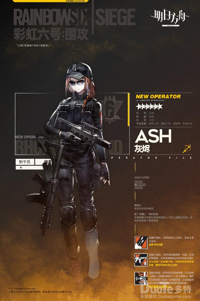 彩虹小队里的每个干员都会有鲜明的武器,灰烬也不例外,两杆轻机枪很符合狙击干员的设定,衣服设计的相较于其他成员很简单轻便,在队伍里起一个快速突击的作用。