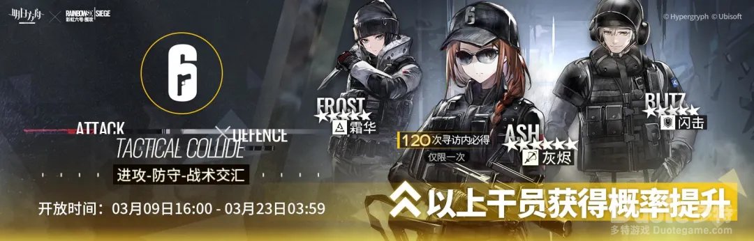 活动说明:活动期间【进攻、防守、战术交汇】限时寻访开启,该寻访中以下干员出现率上升