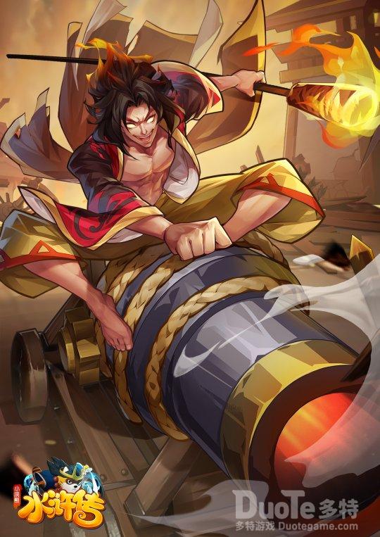 轰天雷·凌振的立绘或许参考了中国古代火药的发明渊源,一身炼丹服颇为考究。也许是想要表达出火炬和火炮之间的联系,但背景的火炮实在是有些粗糙,很难让人第一时间联想到这名掌管梁山最强火力的角色。