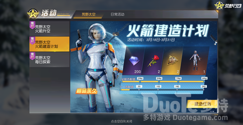 荒野太空系列活动正在火热进行中!每日登录游戏即可领取探索任务,累计登录达到规定天数就能收获永久紫品道具皮肤、至尊军需勋章碎片等丰厚奖励。完成每日建造任务,达到个人贡献值要求即可领取阶段奖励,橙品永久套装大奖“太空探索者”等你来拿!