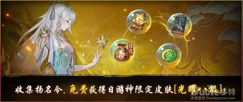 日游神限定皮肤“光耀八极”目前只能通过降妖嘉赏令中的扬名嘉赏令获取,降妖师通过完成3月1日更新的活动任务,即可获取对应数量的扬名嘉赏令,集齐足够数量的嘉赏令后便可免费获取这款皮肤。与此同时,降妖师收集降妖嘉赏令中的奉召嘉赏令与心知嘉赏令,同样能解锁丰厚奖励。