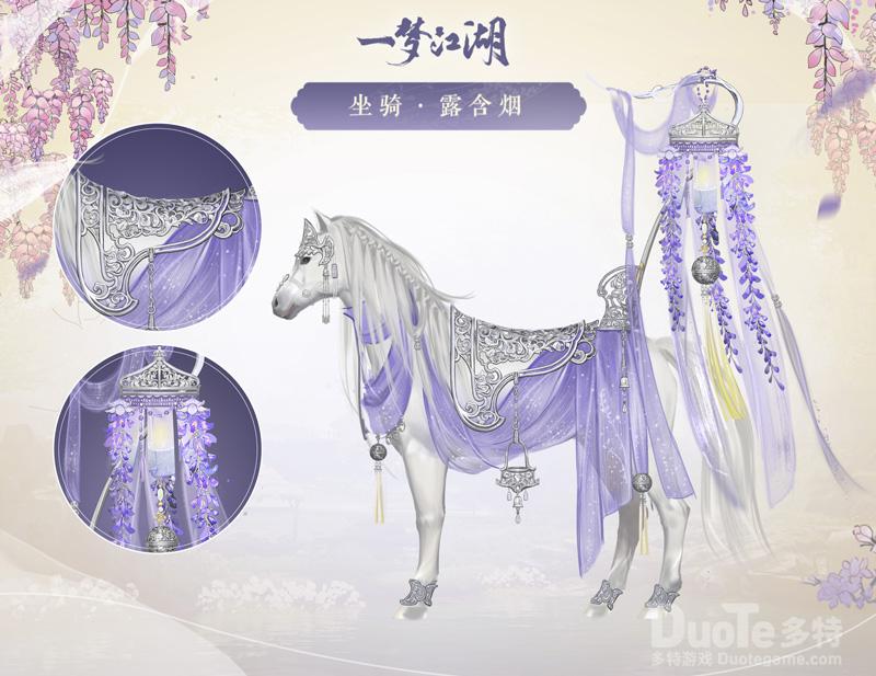 【骑上紫纱白马,享受“万灵昭瑞”】云锦楼的大师傅将紫藤和白马相结合,推出了“坐骑·露含烟”。马身披以紫纱,马背支以紫藤,马车行驶之处,藤蔓摇曳生姿,纱帘缥缈似欢,相信会是少侠们的心头好了!