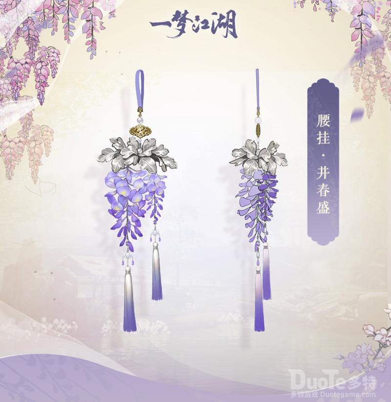 为迎花朝节,云锦楼推出了全新腰挂“并春盛”,小小紫藤花花团锦簇,仿佛汇集了一个春天。花朝节期间,“并春盛”可免费领取。完成每日任务“抽花签”,即可收集兑换道具“藤萝木”,用以兑换寄花朝挂件“并春盛”。