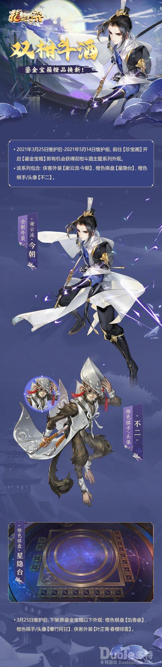 【鎏金宝箱携新品而来,双柑斗酒主题外观今日上架】3月25日维护后-5月14日维护前,各位侠士前往珍宝阁开启【鎏金宝箱】,就有机会获得谢云流年轻版外装【谢云流·今朝】、英气十足的橙色棋手【不二】,更有橙色棋盘【星隐台】等外观等待侠士们前往获取!