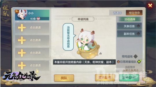 上仙们服务器等级≥45级,可以跨服组队参加日常活动乾坤伏魔以及门派闯关;当服务器等级≥50级时,可以跨服组队参加副本玩法。