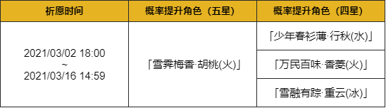 活动期间,限定五星角色「雪霁梅香·胡桃(火)」的祈愿获取概率将大幅提升!