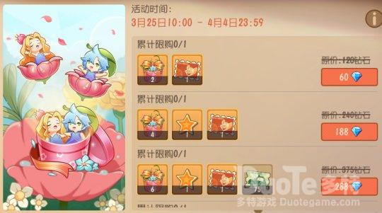 3月25日至4月4日活动期间,花精灵礼物礼盒限时上架,定价30钻,开启后可随机获得牡丹王子、牡丹公主、梅花枝、棒棒糖其中之一。另外在限时商店中,还可使用优惠的价格购买花精灵礼物礼盒、邮票、星星等,小伙伴们不要错过哦。
