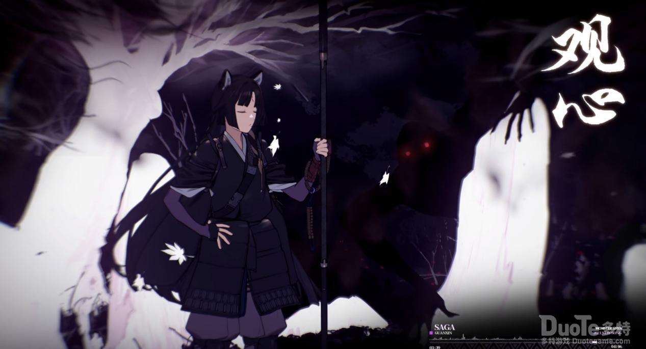 而此时心魔不断涌现出众多黑影和瘆人的红色眼睛,他们虎视眈眈,似乎想要吞噬掉小僧,而嵯峨却摆出最为从容的姿势,仿佛已知胜券在握,又仿佛七情六欲与之无关,不悲不乐。音乐中加入了其他乐器,添了诡异,离奇之感。画面也是在黑白两色带来的冲撞感中,如人心之魅的鬼怪和白色的,似是原初,坚守之心的白,以及持器,凝神而立的嵯峨。而上段的曲风在此时又出现,与那些颇为惑人心之乐声、呢喃、鬼怪成对立。似决心,似是觉悟之曲。