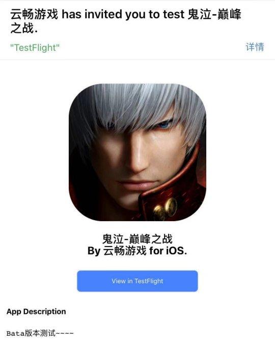 在【TapTap】填写问卷的玩家,请留意查收站内信通知,被选中参与测试的恶魔猎人会收到来自《鬼泣-巅峰之战》的站内信邀请,点击站内信通知跳转《鬼泣-巅峰之战》测试服详情页,点击“试玩”,跳转TestFlight安装游戏;