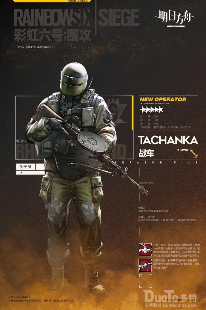 乍一看还以为是“小车组合”又要增加新成员了,结果不是,又一看竟然是个拿枪近卫,实在是有点惊喜。战车的身份很多:彩虹小队成员兼“瞭望台33号”事件的亲历者,成为了罗德岛的合作人员。战车浑身笼罩着迷雾,不知道来自哪里但是战斗素养却出奇的高,或许是在哪个军队里服役过吧。