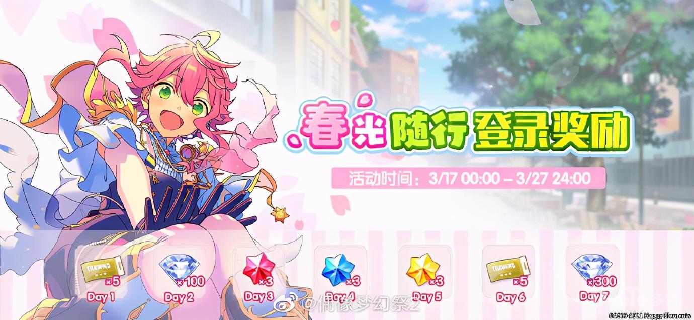 「春光随行登录奖励」在这个浪漫春日,小偶像们因为制作人准备了惊喜。准备好和大家一起在合唱广场欣赏春樱翩翩吗?3月17日00:00~3月27日24:00,「春光随行登录奖励」开启,活动期间,每日登录游戏累计7天可领取【钻石】、【三色大宝石】、【经验券(大)】等丰富的春日礼物。