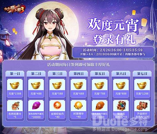 2月26日6:00-3月5日5:59期间,玩家每天登录游戏签到都可领取大量元宝及养成资源福利,累计登录七天还可获得超6000元宝及升金碎片选择包等惊喜好礼,海量福利与你欢度佳节!