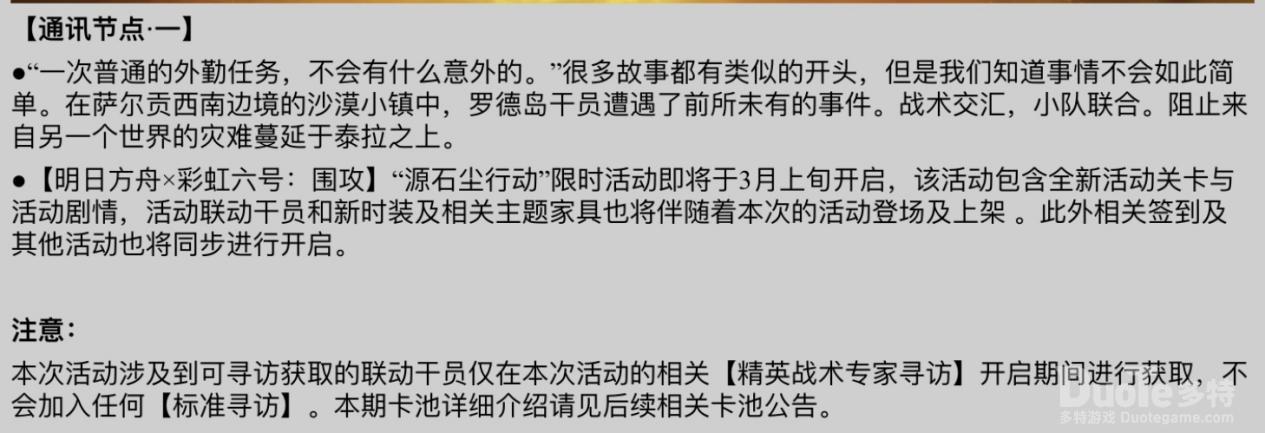近日,热门手游《明日方舟》在其游戏内通讯录中预告了与知名游戏厂商育碧旗下《彩虹六号:围攻》的大型联动「源石尘行动」限时活动的开启。