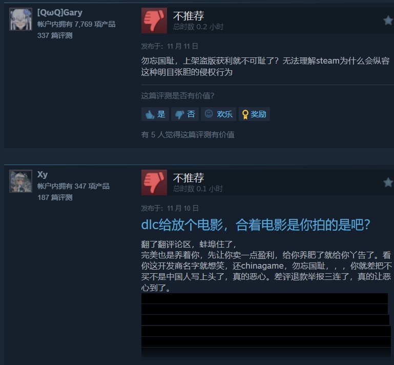 卖盗版赚黑心钱就算了,居然还将发行商&开发商一栏标准为“勿忘国耻”企图贩卖爱国情怀,狠狠收割一波小白玩家,所以评论区自然也有不少老玩家们站出来声讨上架者。