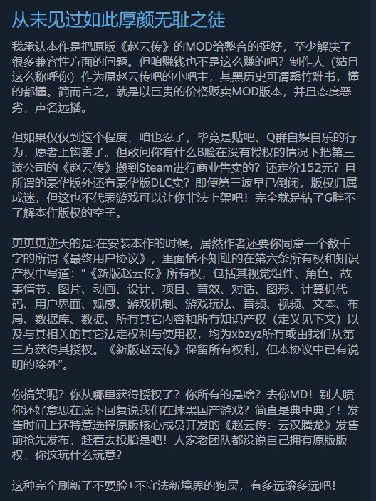 原本这只是一个玩家为年少时期的回忆补票的故事,但在这之前却出了一件比较令人不愉快的插曲。就在《赵云传:云汉腾龙》上架steam的3天前,却突然有一款名为《新版赵云传》的游戏抢先一步登录Steam开始售卖。于是许多玩家就被这游戏的名字所迷惑,以为这就是重制版或新作,纷纷将其加入购物车结算。但实际上这款所谓的《新版赵云传》就是一款彻头彻尾的“赛博山寨货”,也就是我们常说的盗版游戏。根本不是醉江月工作室的新作,更不是《赵云传》的重制版。而是一个ID名为:OneheartX的用户,将老《赵云传》学习版以及各种玩家制作的MOD进行的一个整合版,并没有获得任何授权。