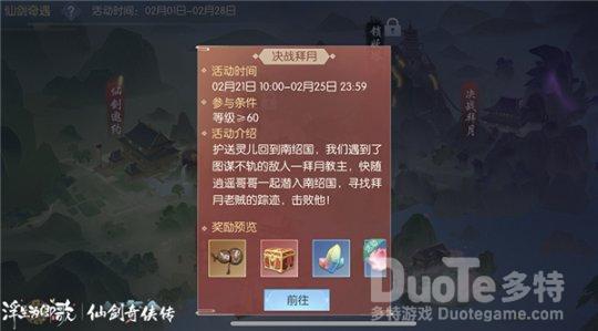 在“决战拜月”玩法中,阁下将和仙剑的小伙伴们一起携手,进入南绍国阻止拜月教主的阴谋,还天下一个太平!在活动中,阁下可在活动中,通过日常玩法来搜索拜月教主以及他的教徒,挑战击败后可获得排名积分以及活动道具女娲石。