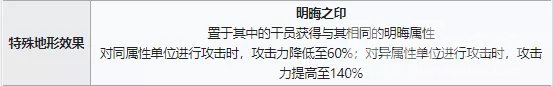 明晦之印的buff在利用得当的情况下,既可以帮助我方干员输出敌人,也可以增强我方干员的生存能力。但如果使用不当,则极易造成战线崩溃,特别是在面对“盛怒”时,只有极高练度的重装才有可能抗住其相克属性的攻击。