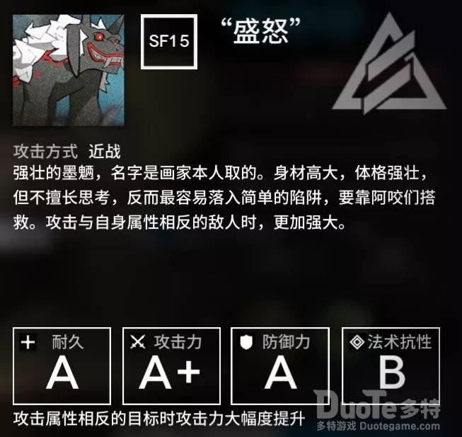 盛怒在攻击相反属性的干员时,会爆发极为恐怖的伤害,面对盛怒时除了注意地面阻挡干员的属性之外,最简单的方式还是在无属性的地面部署干员进行阻挡,提高容错率。