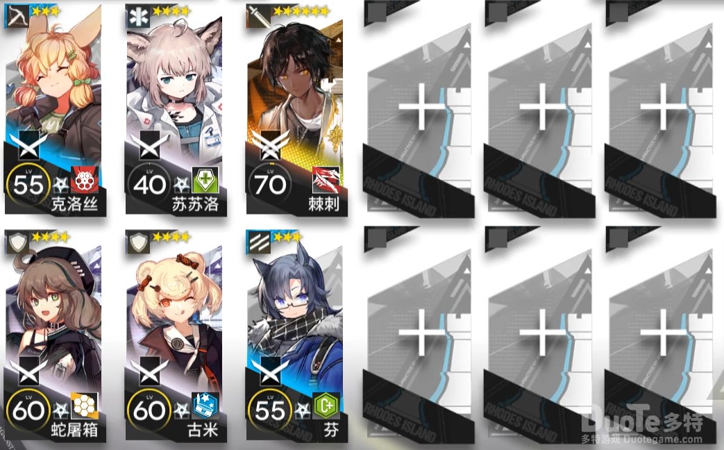 选择以棘刺为核心,负责输出自在以及盛怒。其余干员则需要携带一个先锋,一个重装,一个奶盾以及一个医疗干员,这些干员的练度需要在精一50以上。