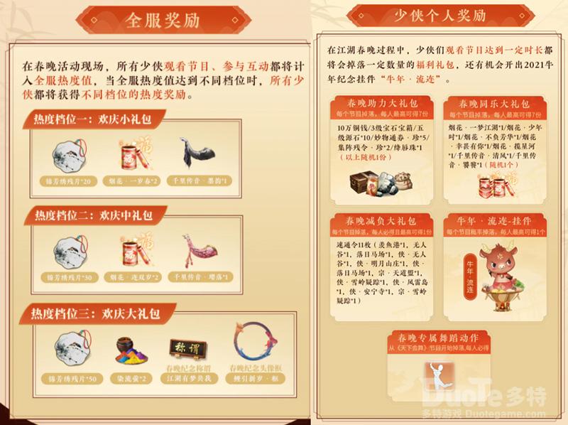 与此同时,在春晚活动现场,所有少侠的观看、参与互动都将计入全服热度值,当全服热度值达到不同档位时,所有少侠都将获得不同档位的热度奖励。而只要观看完整场春晚,将会获得春晚纪念舞蹈表情动作哦!