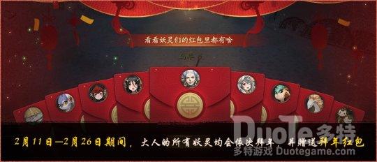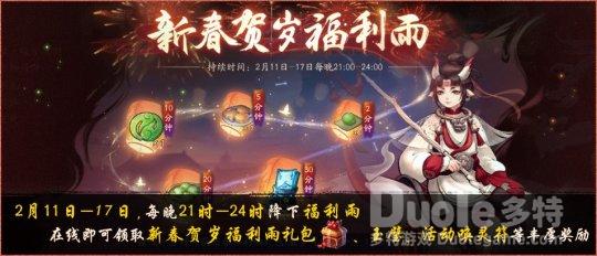 2月7日至25日,降妖师登录游戏进行签到,即可获得玉璧、2021春节唤灵符、紫焰宝钥和景饰券等好礼,签到的第14日还可获得雪中红泥主题家园景饰中的大型景饰“锦布星灯”;2月11日至26日,降妖师麾下的全体妖灵将携礼来贺,SSR妖灵奉上的金色拜年礼盒中还有机会开出太素晶核;2月11日至17日春节假日期间,每日21至24时,神都各处都将落下福利雨,降妖师可根据在线时长获得最高30份新春贺岁福利雨礼包和青团食盒、玉璧、2021春节唤灵符等诱人奖励。