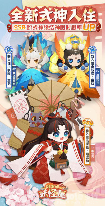 【SSR阶式神缘结神携R阶式神童男、童女入住妖怪屋】全新式神SSR缘结神(CV:雨宫天)、R童男(CV:井上麻里奈)、R童女(CV:加隈亚衣)入住妖怪屋,多重召唤福利助力各位家主与新式神结缘!