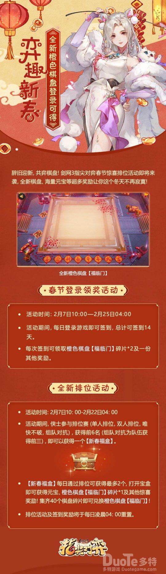 2月7日10:00-2月22日04:00,每日参与排位赛并取得一定名次,即可获得【新春福盒】,其内可开出橙色棋盘【福临门】碎片*1、元宝等惊喜好礼!集齐40个棋盘碎片即可兑换春节主题橙色棋盘【福临门】!
