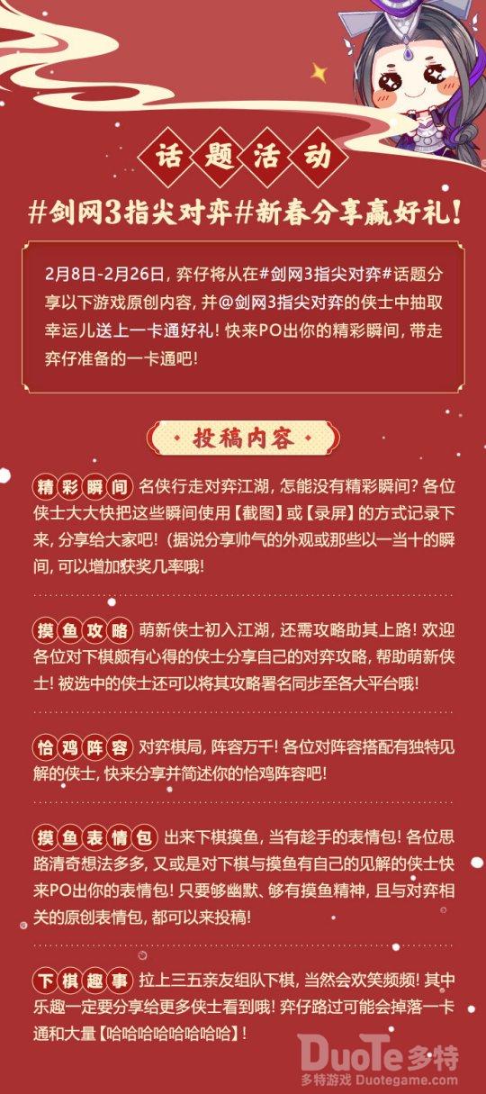 2月8日-2月26日,前往微博#剑网3指尖对弈#话题分享原创内容,有机会获得弈仔送出的【一卡通好礼】!