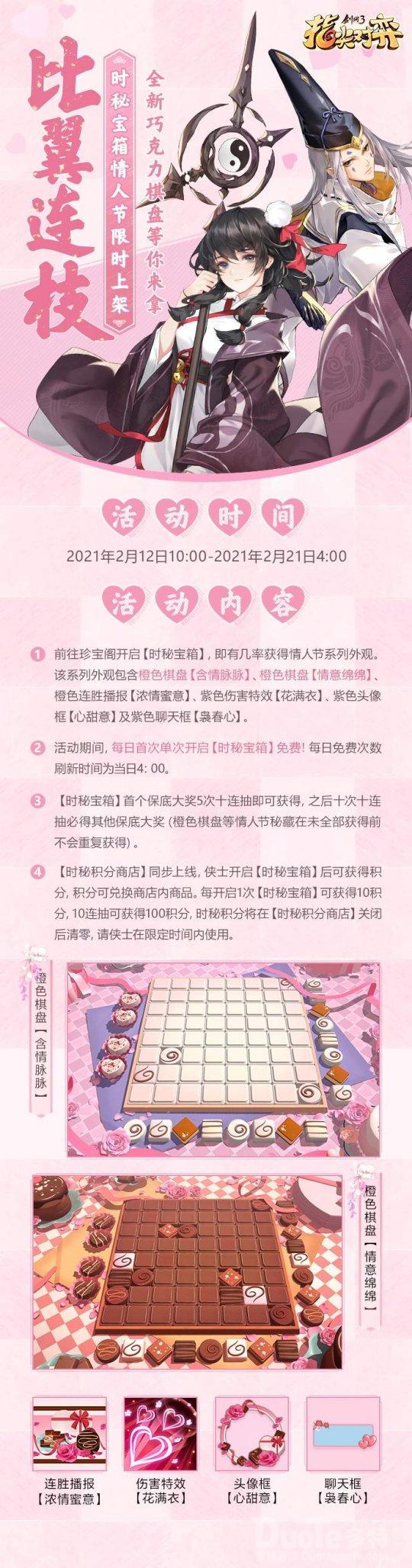 时秘宝箱第四弹将于2月12日上线,情人节限定新品【比翼连枝】系列外观即将限时开放获取,甜美的巧克力棋盘【含情脉脉】、【情意绵绵】;情人节系列连胜播报、头像、伤害特效、聊天框等外观等待各位侠士前来结缘!