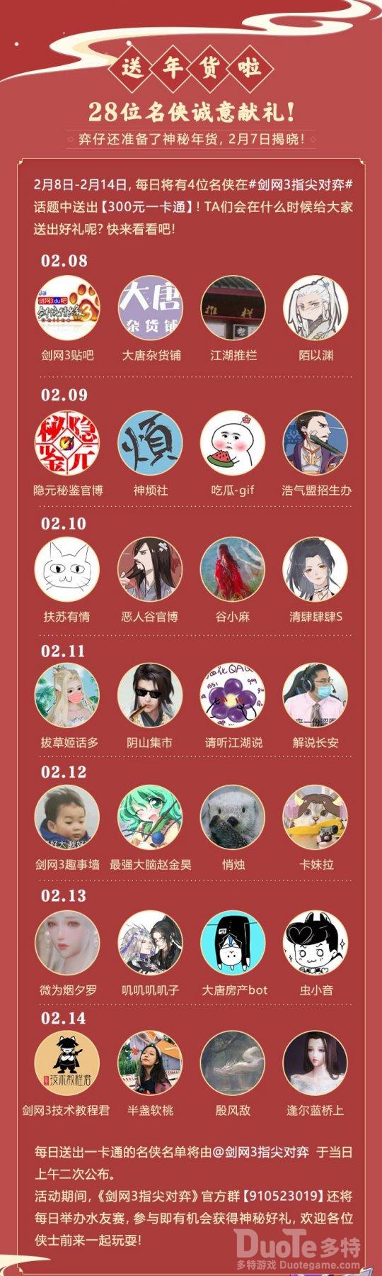 2月8日-2月14日,连续7天,28位名侠将陆续在微博#剑网3指尖对弈#话题中送出海量一卡通,总价值万元一卡通豪礼等你来拿!