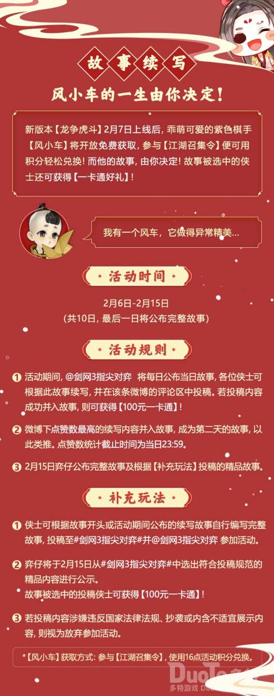 【携手名侠诚意献礼,参与微博活动,诚意豪礼相送】2月6日-2月15日,来官方微博@剑网3指尖对弈 参加故事续写活动,一起续写【风小车的一生】,不仅有机会获得【一卡通好礼】,还有机会将自己编写的内容加入故事,让更多的人根据其拓展!