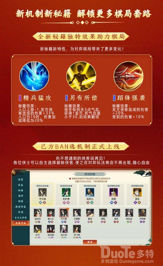 【新机制新秘籍,解锁更多棋局套路】总遇见不想要的棋子?己方BAN选机制帮你解决问题!此功能上线后,侠士可在开战前选择不想使用的棋子,被选择的棋子在该局中不会出现在【自己】的商店中!