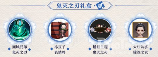 鬼灭之刃礼盒·贰包含[回城咒印·鬼灭之刃]、[大厅访客·缝连之衣]、[播报主题·鬼灭之刃]、[祢豆子表情牌]。