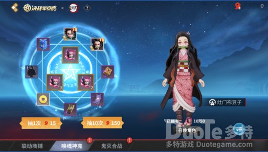 唤魂神龛 集碎片赢心仪角色选定心仪的联动角色后,大大们可凭借指定道具抽取联动角色碎片,集齐50片联动角色碎片即可召唤相应角色。选定联动角色后,仍可返回更换另一角色。道具使用完毕后,大大们可花费勾玉继续进行碎片抽取。