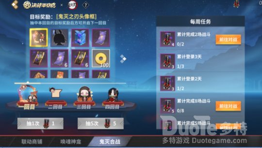 鬼灭合战 赢限定头像框大大们完成任务即可获得[焰纹之印],抽取联动专属奖励。各位大大需要获得当前回目的目标奖励,方可开启下一回目的奖励抽取,同时仍然可以在已开启的所有奖池中抽取剩余的奖励。目标奖励分别为[鬼灭之刃·头像框]、[鬼灭之刃聊天表情集]、[樱子·祢豆子]、[鬼灭之刃·聊天框]。