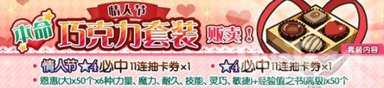 【华伦斯坦情人节限定礼包上线 情人节特别活动开启】2月9日更新后,欧拉丽商城也将迎来更新,情人节本命巧克力套装将会上线。礼包仅在2月9日至3月1日期间限时发售,内含情人节★4必中11连抽卡券、★4必中11连抽卡券、恩惠、经验值之书等多种奖励,各位冒险者大人可按自身需求进行选购。