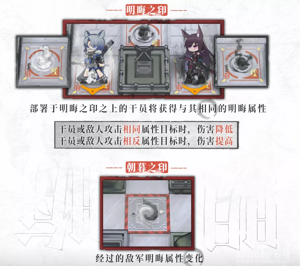 我方干员部署到明晦之印,可以获得和其相同的属性,攻击相同属性的时候,伤害降低,攻击相反属性的时候伤害提高,同时这里还有一个额外的地形设计,敌人通过的时候会造成明晦的变化。