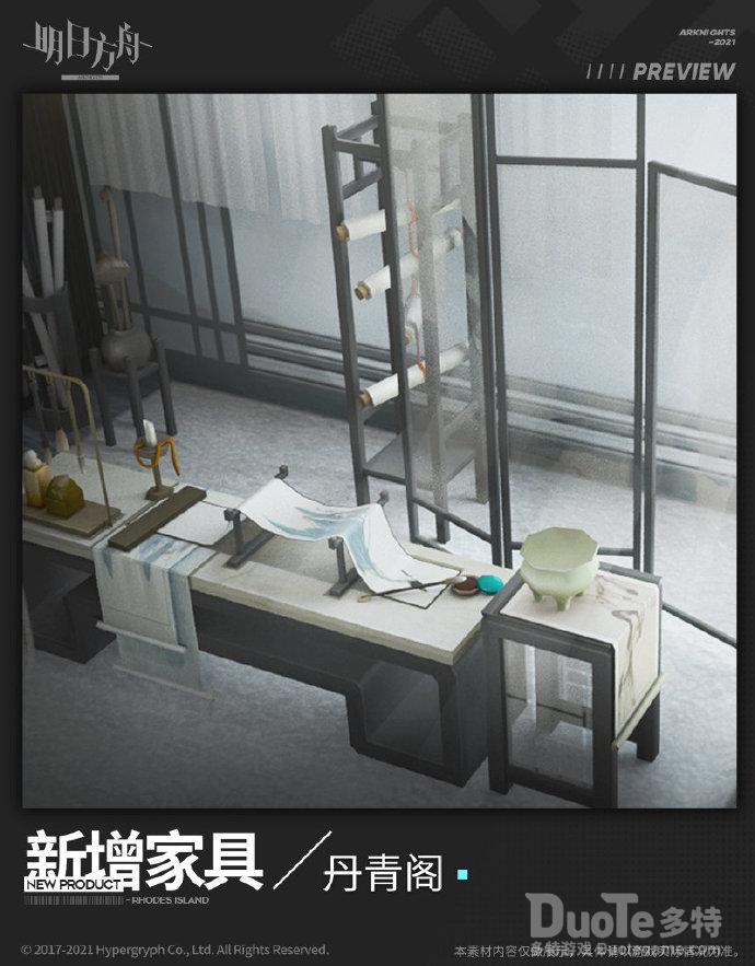 新增家具【丹青阁】。夕小姐画室无数布局中的一种,有幸被造访的干员记录并重现。跟新出的皮肤很贴合即将到来的春节气氛一样,这次的活动家具也很向传统文化靠拢,属于水墨画的风格,黑白的素色搭配显得非常清净幽雅。