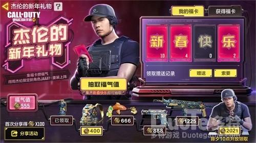2月4号当日,“杰伦的新年礼物”活动重磅来袭!杰伦限定史诗角色JAAAY-重装上阵、史诗挂饰-金鲤戏水、HG40-金鲤戏水等丰富奖励通通可以免费带走!只需完成每日任务收集“新春快乐”福卡,攒够福气值即可领奖。