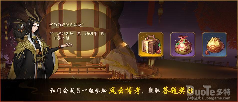 风云博考 满腹经纶赢好礼2月6日至2月12日期间,门会驻地继“武斗”之后即将进入“文考”阶段,“风云博考”活动复刻开启。门会会长、尚书预定考试时间,但范围仅限于周二、四、六、日的18:00-24:00,全部答题完成后系统将根据成绩积分发放奖励。风云博考作为降妖师专属答题活动,奖品池极为丰厚,降妖师们有概率获得太素晶核、唤灵符、玉璧等珍贵奖励。