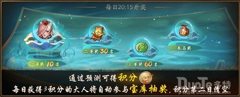 每日竞游大会结束后,龙宫将于20:15开启庆典宝库,发放丰厚奖励为活动助兴。其中一等奖为当天限定的SSR妖灵,名单每日替换更新,降妖师们一定要关注心仪妖灵的轮值时间。