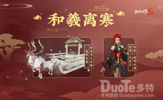 【和羲离寒 全新外观闪耀新春】优雅别致的和风时装与灵动唯美的麋鹿坐骑交相辉映,为这个春节带来一份惊喜与感动。和风时装以深黑为主基调,高级感扑面而来,赤色藤叶缠绕腰间,尽显霸气傲然,颇具特色的盘发与发簪巧妙融合在一起,闪烁出高贵典雅的光芒,实乃佳节必备好物。麋鹿象征着福禄平安,通体雪白的雾眠雪橇坐骑宛如雪地上奔跑的精灵,满载着所有的好运与幸福,带领人们用力奔向新的一年。