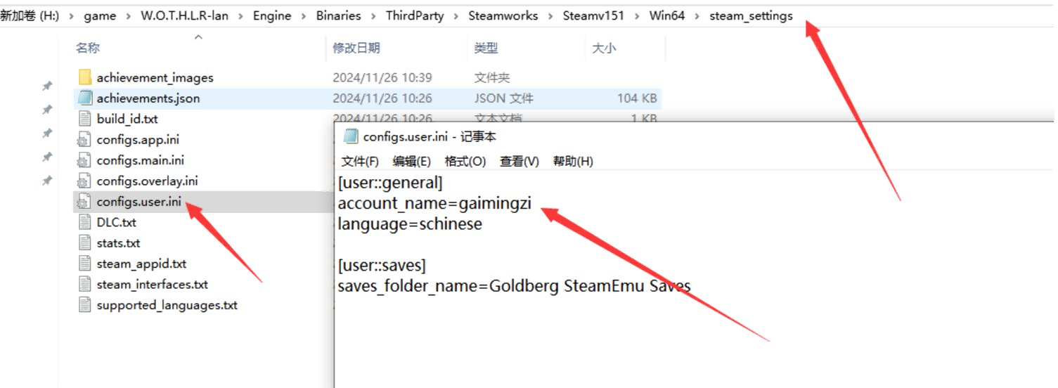 记事本方式打开游戏目录下面的\Engine\Binaries\ThirdParty\Steamworks\Steamv151\Win64\steam_settings\configs.user.ini,把里面的account_name=gaimingzi中的“gaimingzi”改成自己想要的名字,保存。
