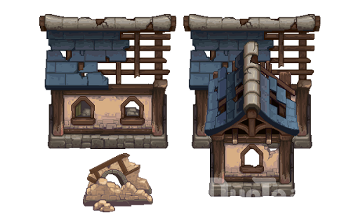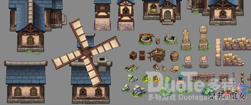 同时,为了符合下层的设定,大部分的建筑都是比较破旧的,而在加了风车元素后,整个村镇的风格,会更偏向乡村一点,建筑以砖块+木板为主,也会辅助的去加入水井、马车等去烘托这个氛围。
