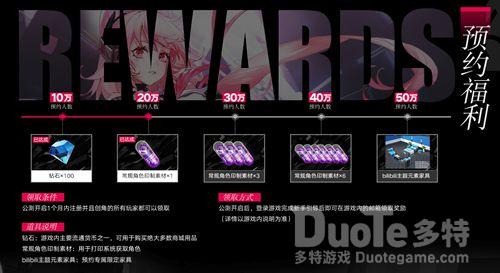 四、预约奖励公开,预约游戏解锁B站联动家具!与此同时,官网预约奖励正式公开!钻石(游戏内主要流通货币之一)、常规角色印制素材(可用于打印系统获取角色)10连抽、预约专属限定bilibili主题元素家具等你来解锁!