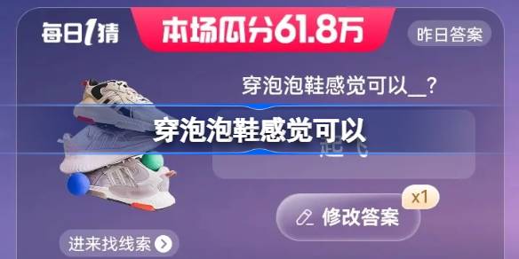 淘宝每日一猜活动正在进行中,每天都会更新商品相关的题目,今天的题目是穿泡泡鞋感觉可以,下面小编为大家带来淘宝每日一猜今日答案5月29日,感兴趣的小伙伴一起了解一下吧。